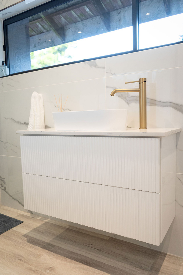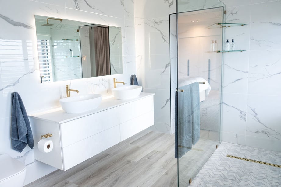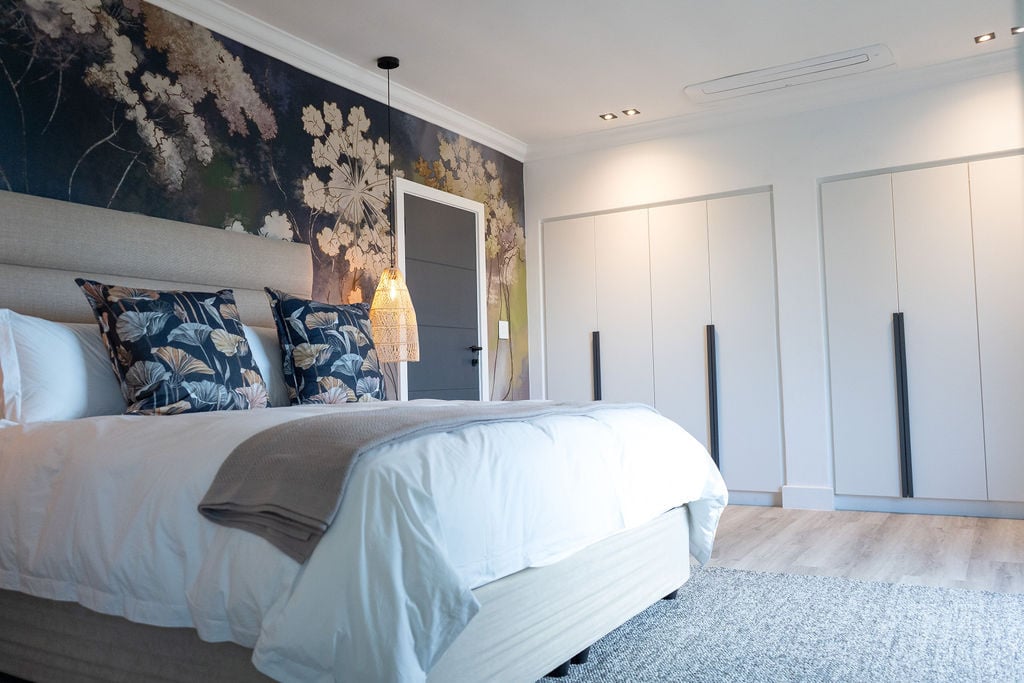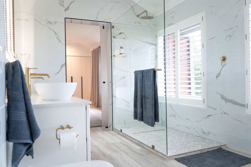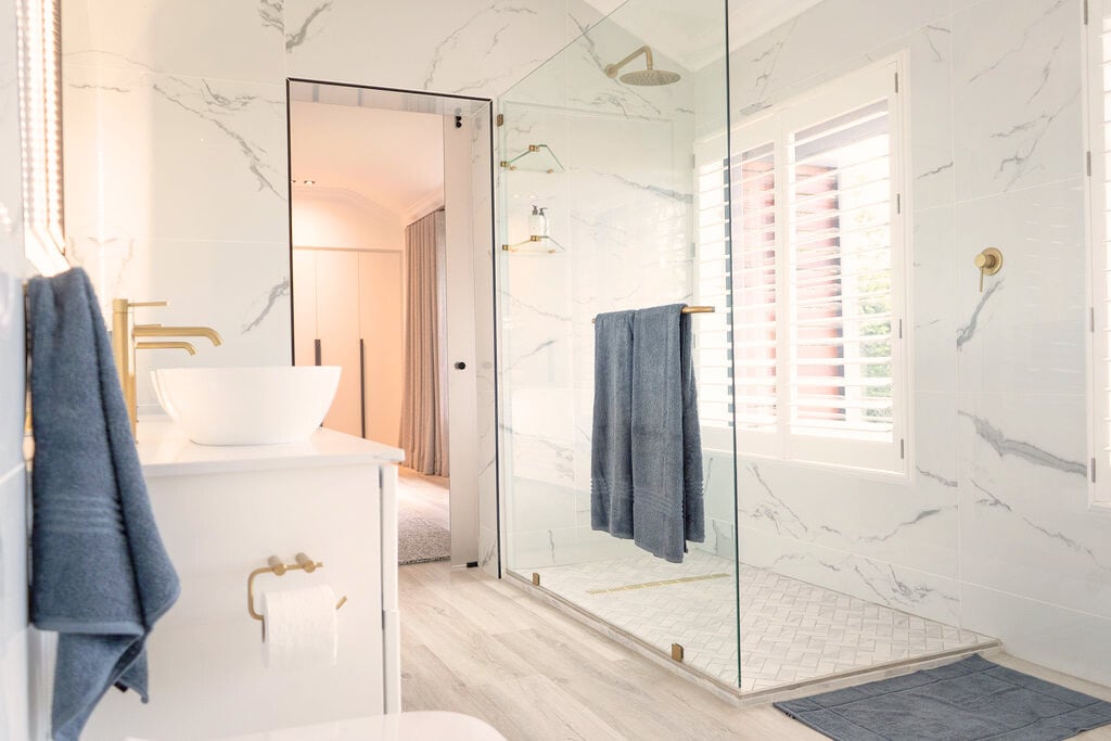 Master bedroom featuring a king-size bed, complete with an ensuite bathroom boasting a double basin, shower, and luxurious freestanding bath.